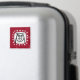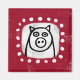 A cute drawn pig in black and white over a red textured background surrounded with white dots.