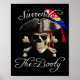 A funny pirate saying with a classic jolly roger pirate skull and parrot, Surrender the booty.