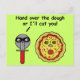 This silly, humourous pun design shows a pizza slicer saying to a scared cartoon pizza, "Hand over the dough or I'll cut you!" The pizza cutter is wearing a black mask like a mugger and the pizza is making a scared face in the form of a round pepperoni mouth, olive eyes and a mushroom nose. The green background colour is customisable.