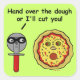 This silly, humourous pun design shows a pizza slicer saying to a scared cartoon pizza, "Hand over the dough or I'll cut you!" The pizza cutter is wearing a black mask like a mugger and the pizza is making a scared face in the form of a round pepperoni mouth, olive eyes and a mushroom nose. The green background colour is customisable.