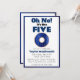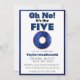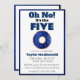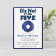This custom party invitation features a funny, police officer birthday theme for a 50th birthday party. An image of a shiny looking blue and gold doughnut is printed in the centre with the birthday "FIVE" printed above it, in reference to the five-o slang term for police officers. The greeting can be read as "Oh no, it's the five-o." It's perfect for a cop with a sense of humour.