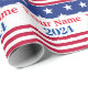 This funny, patriotic, American flag style wrapping paper features a sample name with the election year "2024" printed in blue and the name enlarged and printed in red. You can personalise the wrapping paper to include your own custom name or text. A band of white stars over a dark blue background appear above the slogan and a band of red and white stripes appear below the slogan. The patterns and colours on the wrapping paper represent the American flag.
