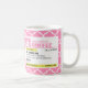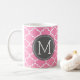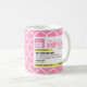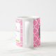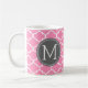 Funny Prescription Coffee Mugs with custom monogram. Write your own prescription! Add your name, your doctor, your favourite coffee and even your own instructions! Make if funny, make it yours! Bubblegum Pink Quatrefoil pattern. Dark grey circle with white monogram.