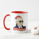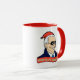 Both sides of this political holiday humour ceramic handled coffee mug are identical and feature a cartoon of president elect joe biden in sunglasses, a deep blue overcoat, a gleaming smile, and a santa hat.