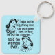 Funny Pro Choice Retro Feminist Political Cartoon keychain in blue. A cool prochoice political humor gift featuring two vintage women telling the government: stay out of my uterus. Anti Trump, anti GOP hilarious pro choice statement about women's rights to healthcare and to choose that reads "I hope we some big, strong men can pass some laws about how to use our uteruses said NO WOMAN EVER." A great female power meme.