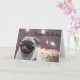 Fawn pug with a happy tongue hanging out funny expression on his face and a cake in the background cute dog lovers birthday greeting card