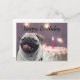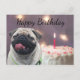 Cute and funny fawn coloured pug has a big happy tongue wagging smile on his face and a birthday cake in the background adorable dog lovers birthday postcard