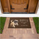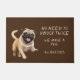 "No need to knock twice, We have a Pug" declares this funny door mat. The text is in tan at the right side, while an image of an adorable little Pug dog is at the left. Everything is placed on a brown background.