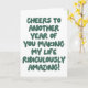 Celebrate your partner with this fun and heartfelt anniversary card! Featuring bold, playful typography, this design delivers a sweet and humourous message—"Cheers to another year of you making my life ridiculously amazing!"—perfect for your spouse, boyfriend, girlfriend, or life partner. Whether it's a wedding anniversary or just another year together, this card adds a touch of joy and appreciation to your special day.