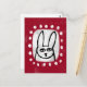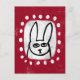 A cute drawn rabbit in black and white over a red textured background surrounded with white dots.