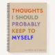 Share your sense of humour with this funny personalised notebook, featuring the playful phrase "Thoughts I Should Probably Keep to Myself" in bold typography. The retro-inspired colour palette of orange, green, purple, and blue on a neutral beige background creates a stylish yet minimalist design perfect for journalling, brainstorming, or venting your unfiltered ideas. Ideal for students, professionals, or anyone with a witty side, this notebook makes a great gift for friends, coworkers, or family who appreciate relatable humour and creative self-expression. Fully customisable with your name or a personal touch, it's both functional and fun. Choose from lined, blank, graph, or dotted pages to suit your needs!