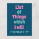 Funny Reminder for Forgetful People Postcard with a funny reminder quote - List Of Things which I will FORGET !!!