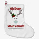Add some humour to your holiday decor with this Funny Retro Christmas Reindeer Family Monogrammed Large Christmas Stocking. It has a cute traditional design with a fun reindeer face wearing a face mask and a holly berry leaf with matching dark red berries are on the antlers. The funny quote is "Oh Dear What A Year" in burgundy red bold curvy retro lettering. Background is white. Family name is across the lower front centre.
