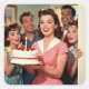 A fun surprise birthday party sticker to seal birthday party envelopes or decorate a gift! The front illustration is a group of retro mid-century friends gathering to surprise someone for their birthday holding a cake with funny awkward expressions.