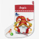 A big nosed, white bearded, funny little gnome wears a red and gold Santa Hat embellished with reindeer images on this cute Christmas stocking. He is getting a bit tangled in the gold ribbon he holds! Two birds perch on him, and another watches from his perch on a green tree bulb. A red border with white decorative trim holds your name in white. Both sides of the stocking have the same image and text.