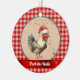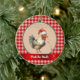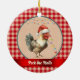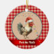 This funny "Peck the Halls" rooster Christmas ornament adds a little farmhouse humour to your holiday decor or Christmas tree. This charming chicken with a Santa hat adds some farmyard whimsy with a touch of holiday poultry fun. A string of lights hangs above the rooster's head, with a partial string of lights hanging from its beak. The rooster is on a pattern of faux tan and white dotted Swiss surrounded by a country style gingham plaid. You can change the humourous text under the rooster, which appears in cream across a ribbon, such as adding your name or year.