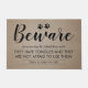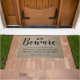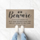 Funny vintage door mat featuring a rustic brown burlap effect background, paw prints, the word "Beware" in an elegant calligraphy font, and humorous sayings about dogs in your household!