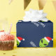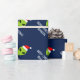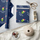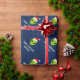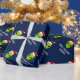 Funny Santa Claus alien Christmas wrapping paper for men women and kids. Green alien head wearing a Santa hat giftwrap personalised with seaspns greeting and name. Funny UFO gift wrap design for Holiday presents. Make one for son, grandson, new baby, grandchild. Extraterrestrial life space cartoon illustration for children (boys / girls) and adults.  Custom colour background ie blue.