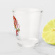 This Holiday shot glass has an image of a cute gnome elf dressed in a red and gold reindeer pattern Santa hat. He holds a Santa Claus wine glass in one hand, and a red and white striped candy cane in the other. Fun for the season!