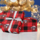 Funny Santa skulls with sunglasses and roses on a red and black buffalo plaid background.