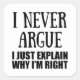If you like funny sarcastic quotes or great humourous designs then this original slogan " I never argue I just explain why I'm right " is for you. It's a great gift for your family, friends, or yourself! This design is ideal for anyone who loves sarcasm and humour. If you like this funny quote, check out more similar artworks in the Omitay store. Stay safe and thank you for supporting a local artist.
