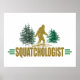 SQUATCHOLOGIST - a humourous title for someone who LOVES everything about Sasquatch and the legend of Big Foot. The design features a giant brown Sasquatch lumbering through a forest of tall green evergreen trees and the word SQUATCHOLOGIST.