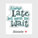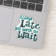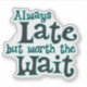 Fun saying Always Late but worth the Wait in a wacky font with black outlined in green. You know who you are.