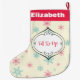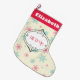 A funny and cute personalised Christms stocking. The background is cream coloured with pink and blue snowflakes. IN the centre is a whiscial hand drawn christmas bauble and inside it says: Fill "er Up. A fun and festive holiday design.