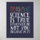 Science Is True Whether Or Not You Believe In It. Inspirational science design for those who believe in scientific proof, lab experiment and research. Cool motivational merchandise for science teacher, scientist and students. Perfect for science geek, nerd, high school teacher and student who love biology, physics and chemistry. Great Christmas gift and birthday present for son, daughter, college friend, brother or sister. Background colour can be customised to your desired colour.