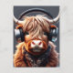 A cute Scottish Highland cow listens to music with headphones
