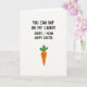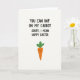 This card features a bright white background with a multi-line joke-style greeting placed across the top in a thick, casual sans-serif font, set in dark lettering for strong contrast. The first line reads like a flirty setup, then quickly turns into a seasonal Easter greeting, giving the layout a friendly wink. Beneath the text sits a single cartoon root vegetable character, centred and slightly larger than the lettering above, like it’s listening in on the joke 🐰. The vegetable is a warm orange cone shape topped with three simple green leaves, and its tiny face is made from two black dot eyes and a curved smile. Soft pink blush marks on its cheeks add a bashful, affectionate look, as if it’s sharing a private laugh with the reader 🌷. The wide open white space around it keeps everything airy, with the orange and green standing out clearly against the background. The message stays at the top while the character anchors the lower half, ending with the orange figure and its three green leaves neatly framed by the empty white area.