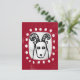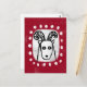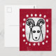 A cute drawn sheep ram with horns in black and white over a red textured background surrounded with white dots.