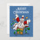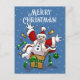 A funny snowman cartoon on a Christmas postcard. Use "Personalize this template" to change the "Merry Christmas!" text and create a unique, customized item. It's maximum Christmas with this excited snowman dressed up as Santa Claus, jumping out of a Christmas present like a jack-in-the-box. The surprise gift is wrapped in gold paisley wrapping paper and a green ribbon with white snowflakes.