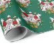 A funny snowman cartoon on Christmas wrapping paper. It's maximum Christmas with this excited snowman dressed up as Santa Claus, jumping out of a Christmas present like a jack-in-the-box. The surprise gift is wrapped in gold paisley wrapping paper and a green ribbon with white snowflakes.