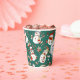This seasonal paper party cup has a fun Holiday pattern made of cartoon snowmen in various activities, including skiing, skating, and shopping for Christmas. The images are primarily in black, red, blue, and gold, and placed on a Christmas teal background. A white circle banner holds your own custom text in red and matching teal.