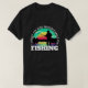 This colourful retro 1980s design shows a man fishing over a scenic background. The words say, "I spent my kids' inheritance on fishing."
