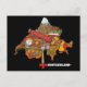 Hilarious Switzerland postcard featuring toblerone, swiss knife, chocolate, cheese, alps and cowbell! Perfect postcard.