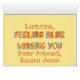 Funny fat tabby cat, sitting on it's haunches, with a forlorn expression because he misses his friend. Next to the cute feline, I Miss My Friend is printed in a two tone font. The colours in the card are golden yellow, burnt orange, pumpkin, dark brown and grey. The inside of the card reads: Feeling Blue Missing You. This card will bring a smile to you friend's face and they will love the fact that you are fondly thinking of them.