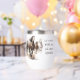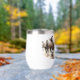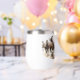 This wine tumbler glass has a pretty watercolor image of running horses. The charcoal grey text beside the image says "Let's drink WINE and talk about HORSES". One side also has your name or monogram in matching grey.