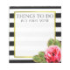 Make your mundane tasks a bit more fun with this funny notepad for women which says "Things to do, but first, wine." Use it for jotting down your epic idea's while planning your wedding or birthday, or use it to jot down the shopping items you forgot the first time, or use it as a to do list. The possibilities are endless. The design features a gold frame and a pink watercolor rose and leaves on a black and white striped background.