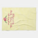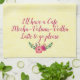 Soft yellow kitchen towel reads I'll have a Cafe-Mocha-Valium-Vodka Latte to go please in pink script. Below that is a pretty spray of pink flowers.