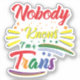 This eye-catching and empowering sticker features the phrase "Nobody Knows I'm Trans" in vibrant rainbow colors, symbolizing pride, self-expression, and identity. A perfect statement piece for Pride Month, LGBTQ+ visibility, and everyday wear, this design encourages authenticity and self-love.