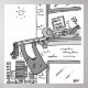Funny Trombone Player Musician Cartoon. Musician is seen through his high-rise flat window with his trombone sticking out of the open window. He has pegged his washing to the trombone. Funny black and white cartoon illustration.