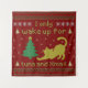 Red Christmas knit-style design with a yellow cat stretching beside a green tree. Text reads “I only wake up for tuna and Xmas.” Cozy pixel/ugly sweater look, fun decoration for cat lovers.