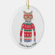 Funny winter holiday Christmas tree ornament featuring a cat wearing red glasses and an "Ugly" Christmas Nordic Sweater. Actually, we think he's rather cute! Add your custom text below or delete. Makes a perfect Christmas or Winter Birthday Gift for cat lovers. Also great as a favour for an Ugly Christmas Party and White Elephant holiday or Secret Santa gift exchange parties.