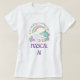 A t-shirt with a cute and funny design. A white uncorn with pastel coloured mane and tail and 3 little stars on her back. A colourful rainbow overhead. Surrounded by a circular wreath made up of clouds, hearts and flowers for additional girly flair. The text says Magical AF. Humourous and adorable.