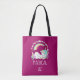 A tote bag with a humourous design. A sleeping uncorn with a fancy mane and tail. Deocrated with a trio of stars stars. A rainbow arches overhead. A circle made up of clouds, hearts and flowers for additional girly flair. Typography says Magical AF. Humourous and cute. The background is a dark pink cerise colour. Edgy and cool.
