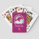 PLaying cards with a humourous design. A sleeping uncorn with a fancy mane and tail. Deocrated with a trio of stars. A rainbow arched overhead. A circular wreath made up of clouds, hearts and flowers for additional girly flair. Typography says Magical AF. Humourous and cute. The background is a dark magenta pink cerise colour.