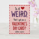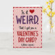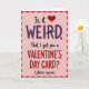 This Valentine's Day card has a blush pink background with a dotted red border that frames everything neatly. In the center, the message is stacked and reads, “Is it WEIRD That I got you a VALENTINE’S DAY CARD? (please say no.)”. “WEIRD” is written in large, deep purple block letters, and a simple black arrow runs through part of the word for a funny, awkward touch. A small solid red heart replaces the dot over the “i” in “Is it,” adding a sweet detail. “VALENTINE’S DAY CARD?” stands out in strong red block letters, while “That I got you a” and “(please say no.)” look like black handwritten script, making it feel personal. The overall look is light, affectionate, and a little self-aware, like someone admitting their feelings with a smile ❤️