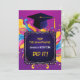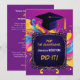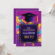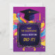 The invitation bursts with a riot of vibrant colours, ranging from cheerful purples and pinks to sunny yellows and radiant blues. At the top of the page sits a dark blue mortarboard hat, adding a touch of scholarly charm amidst the colourful chaos.